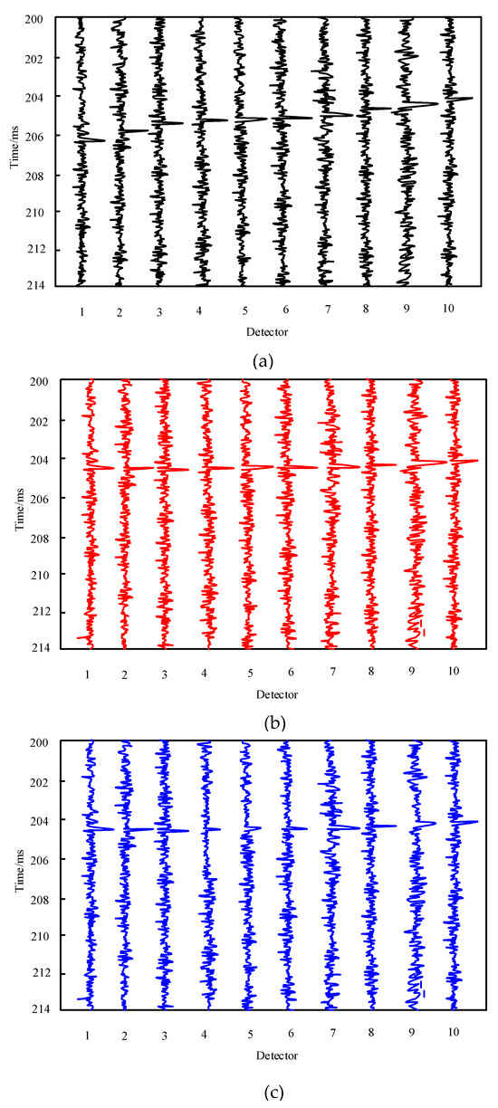 Figure 3. Comparison of microseismic data before and after static correction. (a) Raw microseismic data information. (b) The microseismic data information after static correction using the method described in this paper. (c) The microseismic data information after static correction using the method are illustrated in the reference [6].