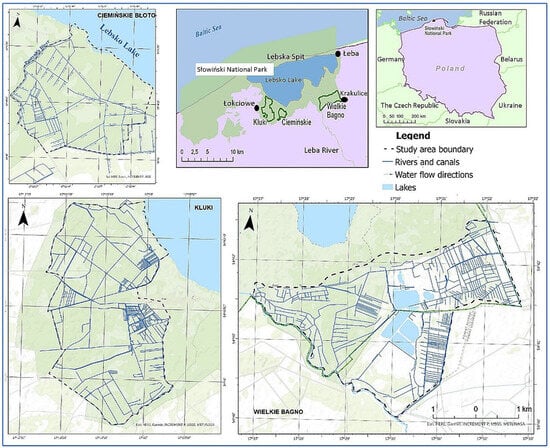 The study area consisted of three peatbogs: Kluki, Ciemińskie Błoto, and Wielkie Bagno. All three bogs are located in northern Poland, in the coastal zone of the Baltic Sea, in the southern part of Słowiński National Park (SNP) (Figure 1). All studied peatbogs are under strict protection. They are located in close proximity to Lake Łebsko and the Pustynka River and Łeba River. There are no larger cities around the peatbogs, only small villages, including: Kluki, Izbica, and Gać.