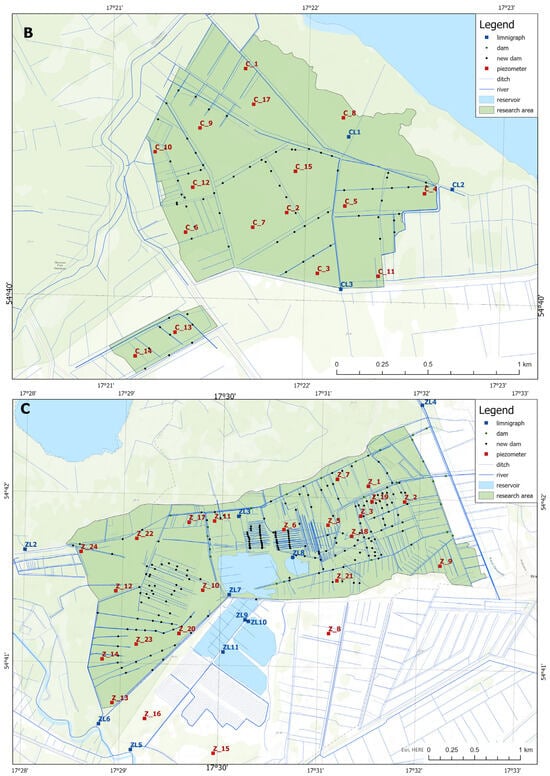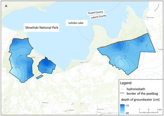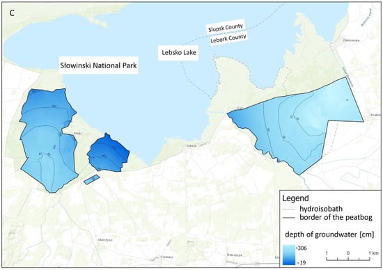 Distribution of hydroisobaths for situations of maximum (A), average (B), and minimum (C) hydration in the area of Ciemińskie Błoto, Kluki Peatbog, and Wielkie Bagno.