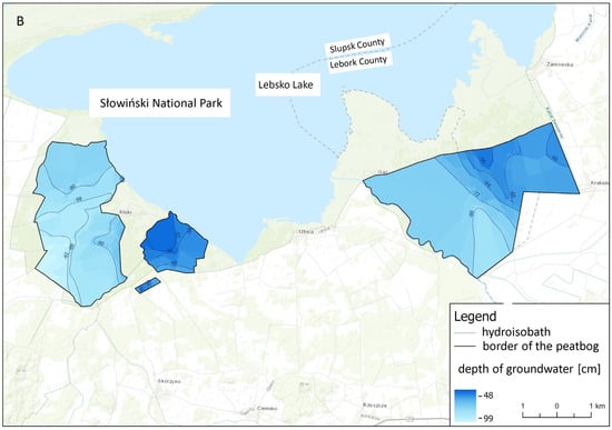 Hydrographically, the peatbogs are located in the lower part of the Łeba river basin. In its lower course, the river flows through an alluvial plain, where it receives numerous streams flowing from the surrounding moraine hills. Flat terrain, river and lake waters, and groundwater flowing down from the plateau mean that the groundwater level on the plain is shallow and sometimes stagnates on the surface. For a better illustration of groundwater retention, Figure 2 shows the distribution of hydroisobaths for all peatbogs, i.e., the image of lines connecting points of the groundwater level on the map occurring at the same depths relative to the terrain surface. They concern three periods, i.e., those of the best, average (medium), and worst water conditions. In the case of the Ciemińskie Błoto peatbog, in an average situation, the depth of groundwater was in the range of 15 to 35 cm below ground level. In turn, in the situation of the best hydration (December), the water table was from 2 cm below ground level (b.g.l.) to 3 cm above ground level (a.g.l.). However, in the situation of the worst hydration (September), the range of groundwater fluctuations in Ciemińskie Błoto was from 52 to 60 cm b.g.l. In turn, in the Kluki Peatbog, the average depth of groundwater is from 20 cm to 60 cm b.g.l. In the case of extremely good hydrological conditions, groundwater remained at a depth of 2 cm b.g.l. up to 8 cm a.g.l., and during the period of extremely bad conditions, it ranged from 80 to 92 cm below ground level. The smallest amplitudes of groundwater level fluctuations occur at points on the edge of the peatbog. The reason for the smallest amplitudes and the high level of water table retention at these points is probably their structure. These are mini domes of an open nature that are located close to the border of the peatbog. Interestingly, extreme amplitudes are characteristic of the southern part of the peatbog. This is because the area has been greatly transformed by humans. There are more drainage ditches here, and there are more areas of cut peat. In turn, the northern part is more uniform and covered with dense forest. However, in the Wielkie Bagno peatbog, the range of variability of groundwater fluctuations ranged from 25 to 55 cm b.g.l. In turn, in extreme situations, the obtained values ranged from 9 cm b.g.l. up to 2 cm a.g.l. (maximum hydration) and from 56 to 80 cm b.g.l. (minimal hydration).
