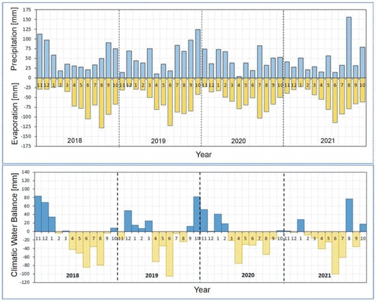 Total annual precipitation in the period 2018–2021 ranged from 553 mm to 677 mm, while evaporation ranged from 709 mm to 753 mm. The most precipitation occurred in summer and autumn, with a maximum in August (156 mm) and October (125 mm), and the least in the spring months, with a minimum in April (4 mm) (Figure 4). The greatest evaporation occurred in the warm months from April to October, with a maximum in August of 128 mm. The lowest evaporation was recorded in the cold months, i.e., from November to March. The absolute minimum evaporation was reached in December (21 mm). The difference between precipitation and evaporation ranged from 75 mm in 2019 to 163 mm in 2021, which means that a negative climate balance was observed for most months in the analyzed period. Only in the autumn and winter periods was it positive for individual months (Figure 4).