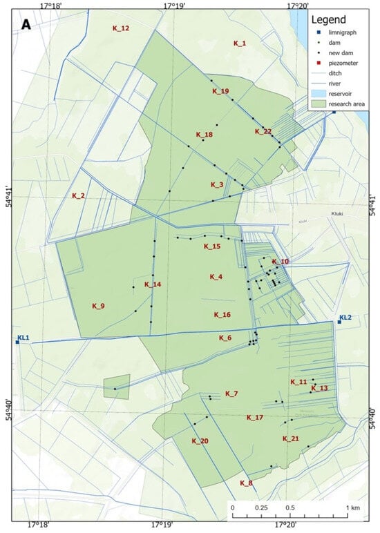 The excess water provoked the commencement of drainage works, which consequently disturbed the natural structure and functioning of the resulting peatbogs []. The first drainage activities date back to the second half of the 18th century and were related to local peat extraction. The work intensified at the end of the 19th century and the beginning of the 20th century. Its goal was to obtain land for agricultural cultivation, to make possible the manual extraction of peat, and to regulate the Łeba River with the intention of draining flood waters. The drainage process during this period significantly depleted groundwater resources in favor of creating a denser surface water network (numerous canals and drainage ditches). After World War II, drainage works were intensified, and the area was adapted to mechanized agriculture and industrial peat exploitation. The last drainage and operational work on the studied facilities took place in the late 1980s. Nevertheless, on the southern outskirts of the Słowiński National Park (SNP), a peat mine in Krakulice, located in its buffer zone, is still exploited to this day.