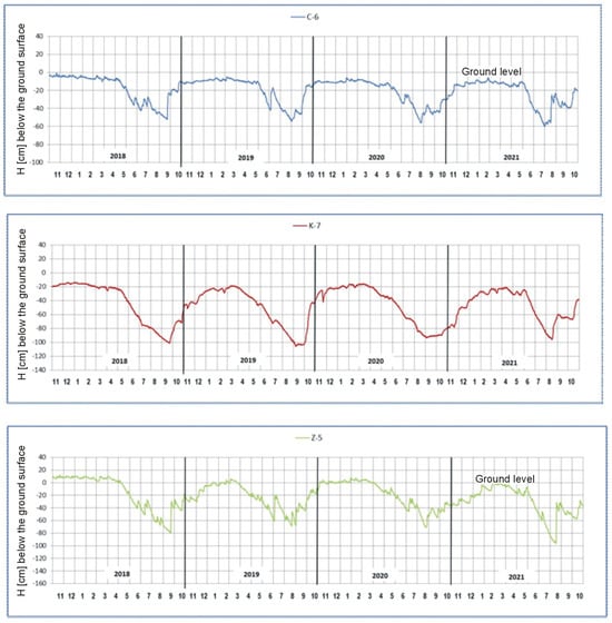 Distribution of water table variability at selected measurement points C6 (Ciemińskie Błoto), K7 (Kluki), and Z5 (Wielkie Bagno), 2018–2021.