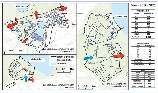 An extremely important problem for the proper functioning of peatbogs is the amount of water supplied and discharged to them through the horizontal hydrographic system. The routes of water escape from peatbogs are especially important because, in situations of significant water loss through this route, it is possible for the peatbogs to dry out and, as a consequence, certain habitats may malfunction. In the case of raised bogs, which have been degraded to a greater or lesser extent in the past, this is a big problem. Water outflow from the studied peatbogs is determined primarily by the amount of atmospheric recharge. Additionally, the amount of runoff increases with increased retention in autumn and winter. For the entire measurement period, in the case of the Ciemińskie Błoto, the total annual inflow was 348,000 m3, and the outflow was 820,000 m3. As a result, through horizontal exchange, the peatbog lost 472,000 m3 of water throughout the entire research period. Water outflows from the peatbog in five places and flows in only at one (point CQ4). The sizes for individual outflows are varied and range from 87,000 m3 (point CQ3) to 350,000 m3 (point CQ1). In turn, Kluki had an inflow of 5,137,000 m3 during the measurement period, and the outflow was 7,539,000 m3, which gives a difference of 2,401,000 m3 in net outflow. The inflow takes place in one place (point KQ1), and the outflow takes place in two places (points KQ2 and KQ3). In the case of the last of the studied peatbogs—Wielkie Bagno—only an outflow of 2,919,000 m3 of water was recorded for the entire measurement period, i.e., 2018–2021. It took place in eight places, on the northern, eastern, and western sides of the peatbog. The variation in runoff for individual points was significant and ranged from 63,000 m3 (point ZQ7) to 801,000 m3 (point ZQ1) (Figure 7). Importantly, considering the obtained results only in terms of size, the largest inflows and outflows are observed in the Kluki peatbog and the smallest in the Ciemińskie Błoto peatbog.