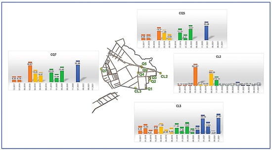 All analyzed peatbogs are located in the close vicinity of Lake Łebsko, which is the largest coastal lake on the Polish coast. There is a large variability in water level fluctuations in the lake resulting from the influence of the Baltic Sea. Higher average water levels occur in the winter half-year (frequent storms), while low levels occur in the summer (increased evaporation). This, in turn, affects the hydrological conditions in neighboring peatbogs. The variability in the water levels in Lake Łebsko is strongly correlated with changes in the groundwater level in the peatbogs, although the response of the peatbogs to changes in lake water is delayed by 2 to 4 months. The inflow of lake waters, characterized by increased salinity, causes increased chloride concentrations to be observed at the points closest to the lake. This applies to both surface and groundwater. For example, in Ciemińskie Błoto, the highest chloride concentrations in surface waters were recorded at point CL2, which is located closest to Lake Łebsko. The absolute maximum ranged from 219 mg·dm−3 (November 2019) to 521 mg·dm−3 (October 2018). They were observed during a storm in the Baltic Sea. In the remaining period, chloride values at this point ranged from 6 to 91 mg·dm−3. No such high concentrations were recorded at the other points. Most often, their values ranged from a few milligrams to 30 mg·dm−3 (Figure 8). A similar situation was recorded for the other two peatbogs (Kluki and Wielkie Bagno), where the highest chloride concentrations were observed during storm periods at points located closest to Lake Łebsko. The same trend was also visible in the case of groundwater. For example, in Ciemińskie Błoto, at points C8, C17, C4, and C5, much higher chloride concentrations were recorded (several hundred mg·dm−3) than at other measurement points (several mg·dm−3) (Figure 9). These are points located along the shore of Lake Łebsko. The same situation occurred for the other two peatbogs.