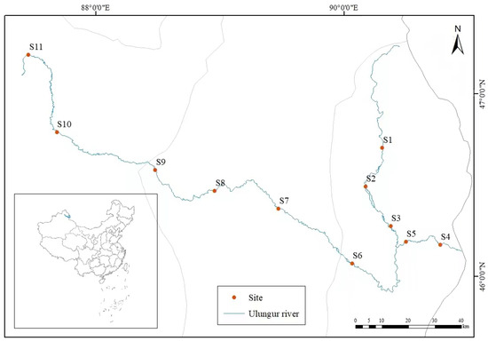 According to the geographical and water system characteristics of the Ulungu River Basin, 11 sampling points were set up in the basin: tributaries—the Daqing River Bridge (S1), Qinggri River Twin Bridges (S2), Agashi Aobao Township (S3), Tucker Shiken Town (S4), and Ihigen Village (S5); and main streams—the Ertai Bridge (S6), Qiakultu Town (S7), Yerk Kala (S8), Dure Town (S9), Kalamagai Town (S10), and Fuhai Bridge (S11). The specific distribution of sampling points is shown in Figure 1. The sampling times were May, August 2022, and October 2023. A D-type net with a 60-mesh aperture and a net port width of 25 cm was used to collect macrobenthos. The collection was repeated three times, and 0.25 m2 was quantitatively collected at each sampling point. The collected samples were placed on a white disk, clean water was added, and various types of macrobenthos were selected on site. The selected macrobenthos were placed into 50 mL specimen bottles filled with a fixative (7% formalin solution). Most of the macrobenthos were identified to the genus level, and a few species were identified to the family level or higher. The identification methods used were Economic Animals of China [20] and Chironomid Larvae of Northern China [21]. The identified samples were counted and weighed to calculate the density and biomass per square meter.