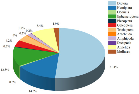 Macrobenthos refers to aquatic animals that live at the bottom of water bodies for all or most of their life history. They are individual benthic animals that cannot pass through a 0.5 mm aperture mesh [8]. Macrobenthos are an important part of freshwater bodies. They are in the middle link in food webs of the ecosystem and are crucial in material exchange and energy flow in the ecosystem. Changes in their community structure will affect fish and other important aquatic organisms through the food chain [9,10,11]. In aquatic environments, macrobenthos have limited mobility and may also respond to changes in water quality through changes in species composition or population dynamics [12]. Macrobenthos are among the most important groups of organisms used to determine river water quality and ecological conditions [13]. Compared with zooplankton and fish, because they live on the bottom of the water for a long time, they are key links in the ecosystem and have strong regional characteristics and weak migratory ability [14]; therefore, they are sensitive to changes in the ecological environment. The quality of the environment directly affects their growth, reproduction, species distribution, and community composition [15]; most of these species are large and easy to identify and collect, so they can be used as indicator species for evaluating water quality. Macrobenthos have been widely used as biological indicators of river water quality in temperate regions [16]. Using macrobenthos to assess river ecological health is the mainstream method for the biological assessment of water quality [17], and it is also an indispensable prerequisite for river ecosystem restoration and management [18].
