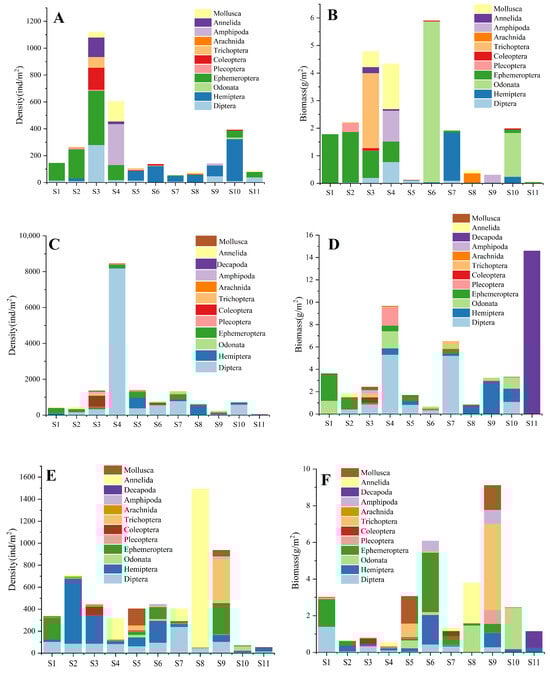 Density and biomass of macrobenthos. (A) Macrobenthic density in May, (B) macrobenthic biomass in May, (C) macrobenthic density in August, (D) macrobenthic biomass in August, (E) macrobenthic density in October, and (F) macrobenthic biomass in October.