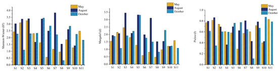 The Shannon—Wiener index (H’) of the Ulungu River in May ranged from 0.57 to 3.25, with an average of 1.91; the Margalef richness index (d) ranged from 0.47 to 2.46, with an average of 1.35; and the Pielou evenness index (J) ranged between 0.29 and 0.83, with an average value of 0.63. The maximum values of H’ and d both occurred in Agashi Aobao Township (S3), and the maximum value of J occurred at the Fuhai Bridge (S11). The minimum values of H’ and J both occurred at Ertai Bridge (S6), and the minimum value of d occurred at Yerk Kala (S8) (Figure 4).