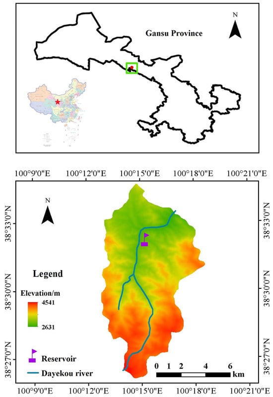 The Dayekou Basin is in the upper reaches of the Heihe River in the middle of the northern foot of the Qilian Mountains of China (100°13′~100°16′ E, 38°16′~38°33′ E), as shown in Figure 1. It starts from Xigouliang in the west, extends to Mazongliang in the east, Pailugou in the south, and Zhengnangou in the north. It originates from the Yeniu Mountain in the Sunan Yugur Autonomous County, and is composed of six tributaries namely, Dongcha, Xicha, Toutangou, Xigoulianggou, Guantaigou, and Shengou. The basin’s area is 80 km2, which belongs to the typical continental semi-arid alpine climate. Mild metamorphic rocks, volcanic rocks, carbonates, and intermediate-acid igneous rocks are widely distributed in the high mountains where the basin is located. The soil-forming parent materials are mainly peat, conglomerate, and purple sand shale. The Dayekou Reservoir, constructed in 1980, is in the Bayi Village Horseshoe District, downstream from the basin. The dam is a masonry gravity dam and is a small reservoir, with a total capacity of 350 m3. It is a regulating reservoir mainly for irrigation and flood control, with an overall irrigation area of 1342.93 hm2. Due to the good water collection function, the dam body goes deep into the bedrock layer, and there is no leakage of water in the catchment area of the basin. The dam body itself is a measuring weir, which can accurately measure the total water inflow of the basin. The change in the reservoir water level can be used to measure the river runoff of the basin, which solves the problem of monitoring river runoff in medium-scale basins for a long period of time. This basin is characterized by different types of landcovers (See Figure S1), such as a closed forest (the most common landcover), sparse wood land, high coverage grassland and many more.