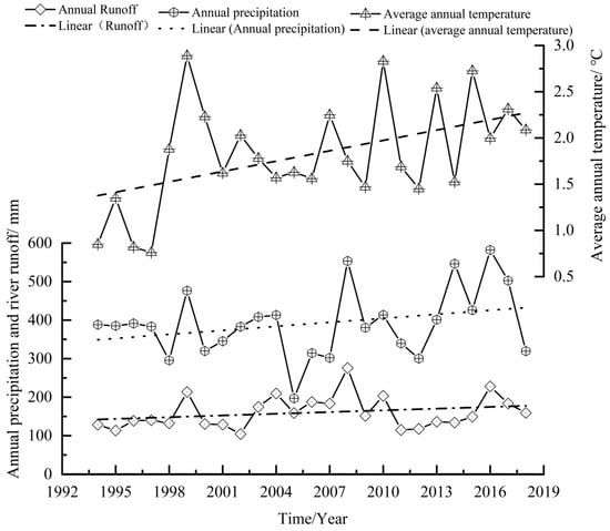 where y is the series of runoff and climate factors, x is the time series, b is the linear trend term, and 10b is the climate tendency rate of runoff and climate every 10a (°C/10a or mm/10a). The results of the linear regression calculations indicate that when the tendency of runoff and climate variables is greater than 0, it signifies an upward trend over time, while a tendency less than 0 indicates a downward trend. The magnitude of these values reflects the degree of fluctuation in the rate of climate change, indicating the extent of the rise or fall in trends.