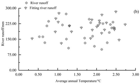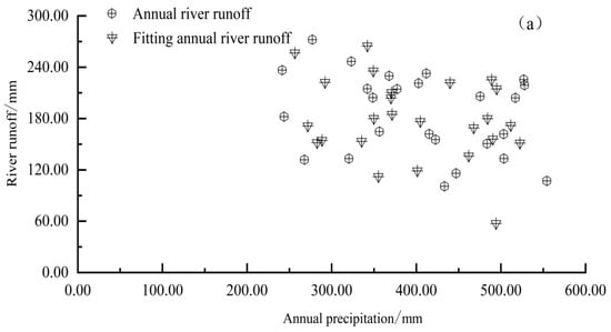 In the formula, r, p and t represent the annual river runoff, annual precipitation, and annual average temperature, respectively. In the statistical table of the F test (Table S4), the test value of F at this time is 21.32, far greater than F0.05 (2,15) = 3.68. The re-examination t test (Table S5) demonstrates the regression coefficient a = −25.82, b = 27.02, the test coefficient T1 = 3.47 and T2 = 5.41, with both being greater than T0.05/2 (15) = 2.182.