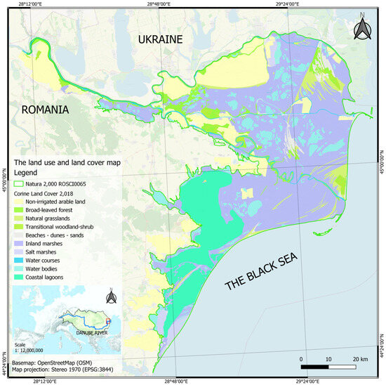 Figure 1. Focus map of land use in protected natural areas of Danube Delta Biosphere Reserve (ROSCI0065); data source https://land.copernicus.eu/en/products/corine-land-cover (accessed on 20 November 2023).