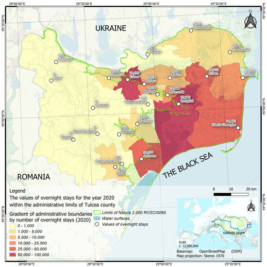 Figure 5. Focus map of the total number of overnight stays in tourist accommodation structures within the administrative limits of Tulcea County for 2020.