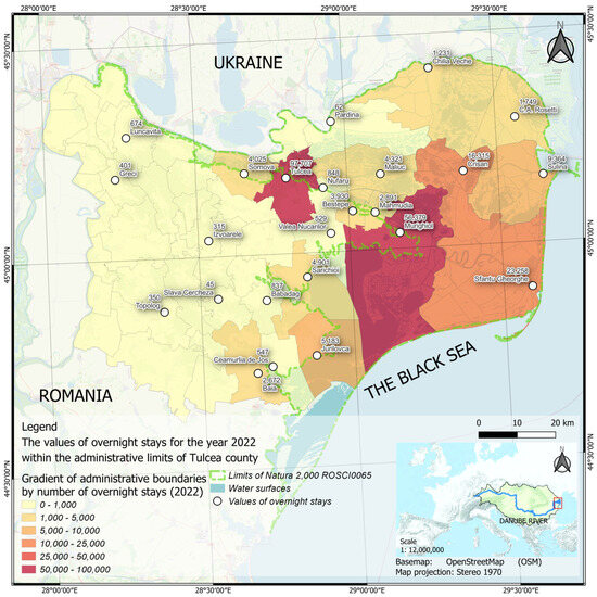 The focus map of the total number of overnight stays in tourist accommodation structures in Tulcea County is an essential resource for understanding the WEF nexus in the context of tourism. By identifying areas with high tourist activity, this map contributes to a holistic view of how tourism intersects with local resource utilization. It provides insights into water and energy consumption trends in areas with dense tourist concentrations, which is crucial for sustainable WEF management. The delimitation of areas with intense tourist activity provides a clear perspective on the places with the largest flow of tourists and related activities. The map is also a tool for monitoring tourism trends over time. Changes in overnight stays offer crucial insights into the dynamics of tourism activities, enabling the continuous refinement of development strategies in response to these fluctuations. Using statistical data from the INSSE database, maps depicting the total number of overnight stays in tourist accommodation facilities within Tulcea County’s administrative boundaries were generated for the years 2020, 2021, and 2022 (Figure 5, Figure 6 and Figure 7). They show that the number of overstays in these three years was almost the same, even though these maps aimed to represent a dynamic view from year to year. These maps serve as an input for CFMs, complementing the basic static information provided in the focus map of tourist attractions per ATU (Figure 3) and the focus map of touristic and leisure routes (Figure 4).