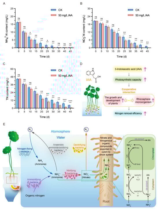 Zhang, M.; Xiang, W.; Song, F.; Zhu, H.; Cai, T.; Tang, J.; Zhang, Q. Impact of Exogenous Indoleacetic Acid on Nitrogen Cycling-Associated Bacteria in the Rhizosphere and Eutrophic Water Surrounding Hydrocotyle vulgaris Lam. Water 2024, 16, 924. https://doi.org/10.3390/w16070924