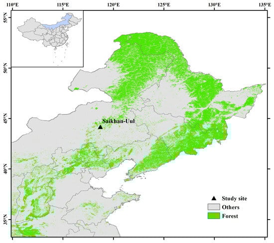 Location of the study area in Northeast China and its distribution of forests (green). “Others” refers to land use types other than forest land (gray).