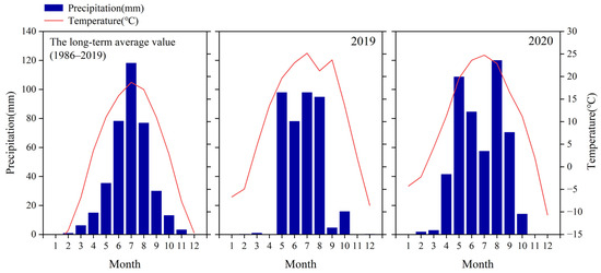 The long-term average monthly precipitation (mm) and temperature (°C) for 1986–2019 and the monthly precipitation (mm) and mean monthly temperature (°C) for 2019 and 2020.