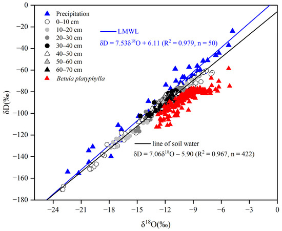 The variation ranges of the precipitation and soil water δD and δ18O were from −263.46‰ to −23.96‰ and from −33.85‰ to −4.80‰ as well as from −170.36‰ to −60.69‰ and from −23.05‰ to −6.97‰, respectively. The ranges of δD and δ18O in xylem water were form −112.65‰ to −58.55‰ and from −12.94‰ to −5.11‰, respectively. The average values of δD and δ18O in xylem water were −86.35‰ and −9.82‰, which were higher than the average values of −90.89‰ and −12.04‰ in the soil water of the area, respectively. The local meteoric water line (LMWL: δD = 7.53δ18O + 6.11, R2 = 0.97, p < 0.001) was derived from the precipitation isotopic data. Notably, the slope and intercept of the LMWL were observed to be lower than those of the global meteoric water line (GMWL: δD = 8δ18O + 10) [38] (Figure 3), which suggests that the local precipitation was influenced by evaporation, reflecting climatic characteristics characterized by reduced precipitation and increased evaporation [11]. Figure 3 shows that the xylem water of Betula platyphylla mainly comes from soil water.