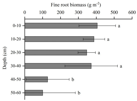 Vertical distribution of fine root biomass. Different letters indicate significant differences between categories. Error bars represent standard errors.