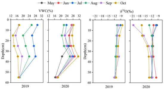 Vertical soil profiles of VWC and δ18O values of soil water for each month in 2019 and 2020.