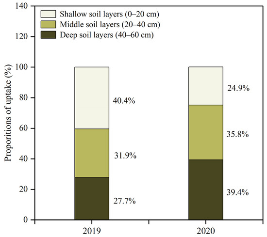 The interannual variations revealed distinct differences in the utilization rates of soil water across different soil layers between 2019 and 2020 (see Figure 7). In 2019, soil water from the shallow soil layers (0–10 cm and 10–20 cm) was predominantly utilized, with a utilization rate of 40.4%. Conversely, in 2020, the primary utilization of soil water occurred in the deep soil layers (40–50 cm and 50–60 cm), with a utilization rate of 39.4%. This shift in water utilization patterns in 2020 suggests that heavy rainfall led to a decrease in the utilization of shallow soil water, while a higher proportion of deep soil water was utilized. This implies that increased precipitation may have replenished the deep soil water, enabling Betula platyphylla to access and utilize it effectively.
