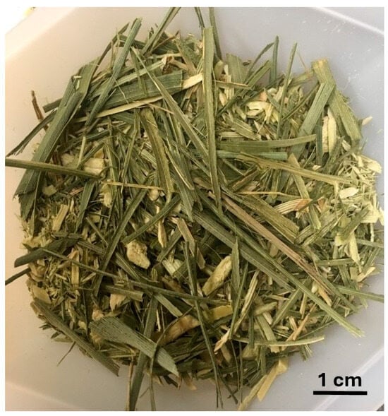 Giant reed with stems of approximately 2 m in height and without flowering plumes were selected for this study. Plants were collected from an urban stand in Lubbock (TX, USA), rinsed with tap water, and air-dried for 24 h. The stems and leaves were first chopped into small pieces with an electric garden chipper (GS70015, Earthwise, Indianapolis, IN, USA) and then cut into fine chips using a kitchen chopper (Nj100Gr, Ninja, Needham, MA, USA). Chips were placed in a heater at 60 °C for 48 h and the dried material (Figure 1) was stored at 4 °C in a desiccating chamber. For use in cultures, the appropriate amount of chips was placed in sterilized (autoclaved), drawstring tea filter bags and immersed in the experimental flasks. In initial experiments, cultures were started (inoculated) upon immersion of the bags in the flasks. In later experiments, chips were allowed to leach for 24 h at 4 °C and the leachate was collected and filtered sequentially with 0.45 and 0.22 µm syringe filters (SLHAM33S, SLGSR33SS, Sigma-Aldrich, St. Louis, MO, USA) before use. The latter procedure was applied to minimize the presence of debris and bacterial contamination in the cultures.