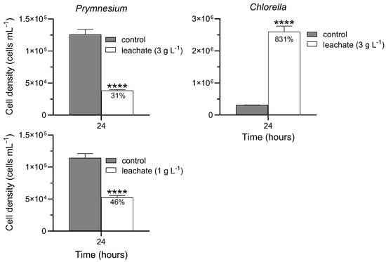 The range-finding test with direct immersion of dried chips into culture media showed that P. parvum growth is inhibited in a concentration-dependent manner, with an estimated 24 h IC50 of 3.1 g L−1 (±0.8). Leachate at 3 g L−1 showed algicidal activity (negative growth) against P. parvum; namely, cell density at 24 h was lower (38,333 cells mL−1) than the initial density (50,000 cells mL−1) and significantly lower than control values at 24 h (31 percent of control; t-test, p < 0.0001) (Figure 2). At 1 g L−1, leachate showed algistatic activity (growth suppression); namely, cell density at 24 h was similar (52,500 cells mL−1) to the initial density (50,000 cells mL−1) but significantly lower than control values at 24 h (46 percent of control; t-test, p < 0.0001) (Figure 2). In C. sorokiniana, leachate at 3 g L−1 stimulated growth; namely, cell density in the leachate cultures was 831% of the control value at 24 h (t-test, p < 0.0001) (Figure 2).