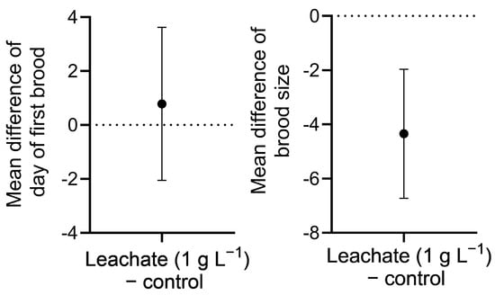 Effect of leachate from giant reed (Arundo donax) at 1 g L−1 on day of first brood production and cumulative brood size at 21 days in Daphnia pulex. Plots show the difference between the leachate-exposed and the corresponding control group. Differences are significant when the 95% confidence interval does not cross the zero dashed line (nested t-test, p < 0.05). Plots represent the combined values of two trials (n = 24 per treatment group per trial). Control mean values for day of first brood and brood size are 14.2 days and 9.8 neonates, respectively.