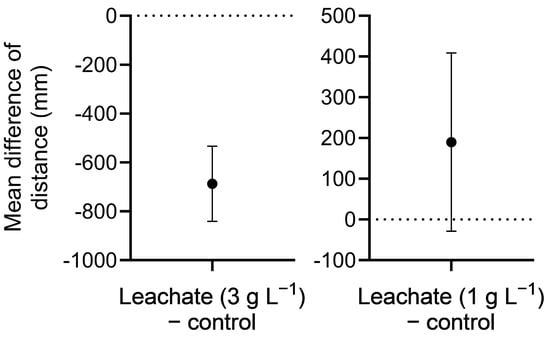 Effect of leachate from giant reed (Arundo donax) at 3 and 1 g L−1 on swimming distance (startle response of larvae to light stimulation) in 5-day-old Danio rerio larvae. Plots show the difference between the leachate-exposed and the corresponding control group. Differences are significant when the 95% confidence interval does not cross the zero dashed line (nested t-test, p < 0.05). Plots represent the combined values of two trials (n = 24 per treatment group per trial). Control mean values for swimming distance at 3 and 1 g L−1 are 920 and 942 mm over a 20 min period, respectively.