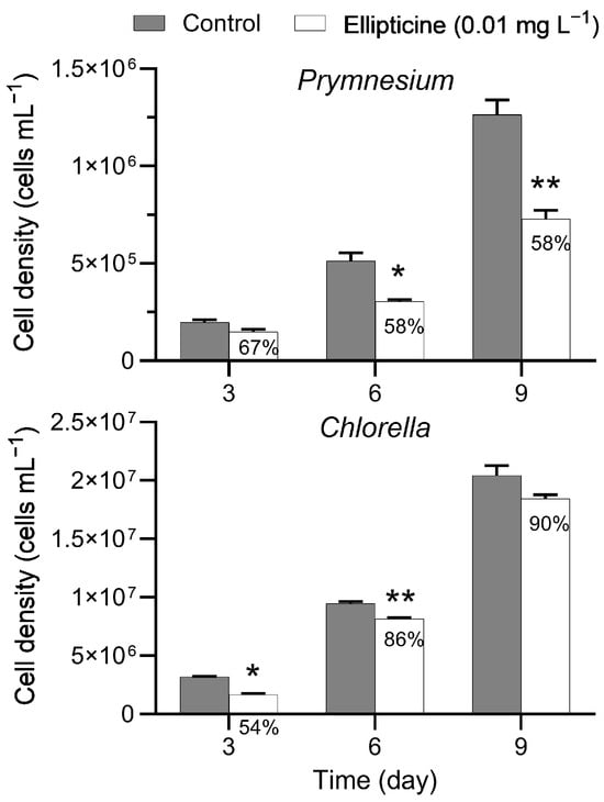 Effect of ellipticine at 0.01 mg L−1 on growth of Prymnesium parvum and Chlorella sorokiniana on days 3, 6, and 9. Bars represent the mean value of three replicate cultures (+SEM). Numbers within the ellipticine bars indicate percent value relative to the corresponding control group. * p < 0.05; ** p < 0.01 (Sidak’s multiple comparison test).
