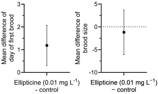 Effect of ellipticine at 0.01 mg L−1 on day of first brood production and cumulative brood size at 21 days in Daphnia pulex. Plots show the difference between the ellipticine-exposed and the corresponding control group. Differences are significant when the 95% confidence interval does not cross the zero dashed line (nested t-test, p < 0.05). Plots represent the combined values of two trials (n = 24 per treatment group per trial). Control mean values for day of first brood and brood size are 13.7 days and 11.1 neonates, respectively.