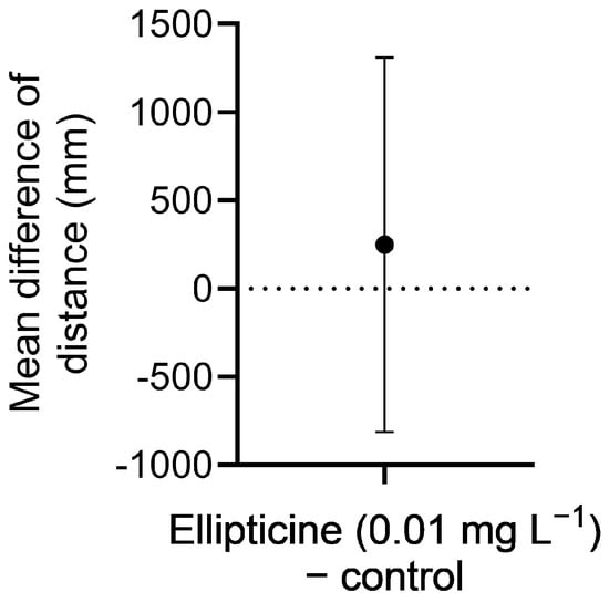Ellipticine at 0.01 mg L−1 showed no effect on D. rerio hatch rate (Fisher exact test, p > 0.05; average of 93.8% for control and treatment) or post-hatch survival (100% for control and treatment) in both trials. In addition, ellipticine had no effect on swimming distance (nested t-test, p < 0.05; trial did not influence results) (Figure 7). One swimming distance value from one of the control trials was identified as an outlier by the ROUT test and was excluded from the dataset before analysis. Data from all treatments passed the normality test, including the one control trial after the removal of the outlier value.