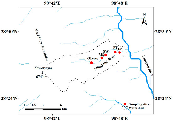 Southwest China is a core region under the dual influence of South Asian/Indian monsoons and East Asian monsoons. The water vapor source of precipitation and its influencing factors are quite complicated. Some empirical studies have been carried out on the water vapor sources and different characteristics of hydrogen and oxygen stable isotopes in the southwest monsoon region, and relatively rich research results have been obtained [13]. The Meili Snow Mountains are located in the Hengduan Mountains, the southeast margin of the Tibetan Plateau, which has the largest topographic fluctuation in China. The vertical climate zone of dry and hot valley in this area develops, with complex ecological conditions and obvious climate spatial differentiation. The study of this region is conducive to revealing the glacier change characteristics and the hydrological cycle significance in the southeast of the Tibetan Plateau. The glacier water resources in the Meili Snow Mountains area will continue to shrink under the background of global warming and the general decrease of precipitation [14]. Compared with other regions of the Asian continent, the elevation change of the glacier surface in the Meili Snow Mountains is the most obvious [15]. The Mingyong River is an important tributary of the upper reaches of Lancang River. The ice-melt water of the Mingyong Glacier in the upper reaches plays an important role in groundwater recharge [16]. At the time of the first glacier inventory, the terminal elevation of the Mingyong Glacier was as low as about 2700 m, which is the lowest glacier in the Hengduan Mountains, and also the largest and longest temperate glacier in Yunnan Province [17]. According to the survey and measurement in July 2022, the glacier retreated strongly with the terminus about 2830 m under the influence of climate warming. It can be seen that the Mingyong Glacier changes in the Meili Snow Mountains have a significant response to climate warming. At present, there are more qualitative descriptions of surface observations and climate changes in this area, but there are relatively few studies on the quantitative characteristics of runoff components in glacier basins in this area. Therefore, it is very important to carry out research on hydrograph separation in this area. At the same time, ice-melt water, as an important climate feature, reflects not only the change of climate characteristics on a single scale, but also the multi-scale environmental coupling effect, and its research significance is even far greater than that of large and medium-sized rivers in common inland basins. So, what are the scientific questions researchers are trying to figure out? (i) Under the background of global warming, how does the content of stable isotopes of hydrogen and oxygen in the natural water body of the Mingyong Glacier basin in the Meili Snow Mountains change? (ii) What is the relationship between the recharge sources of the runoff from the lower reaches of the Mingyong Glacier basin in the Meili Snow Mountains? These questions are worthy of an in-depth study.