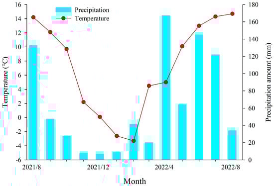 The monthly precipitation amount and mean temperature in Deqin Meteorological Station (data from the China National Meteorological Sciences Data Center: http://data.cma.cn (accessed on 18 October 2023)).