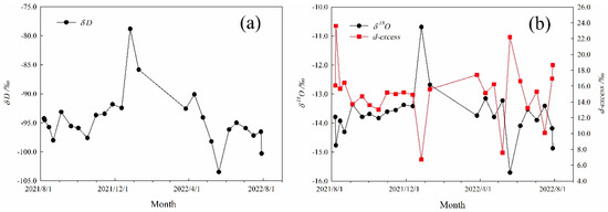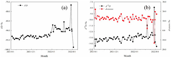 The range of δD (a), δ18O, and d-excess (b) in river water (river midstream) from 7 August 2021 to 7 August 2022.