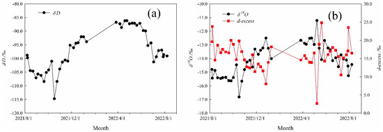 The range of δD (a), δ18O, and d-excess (b) in ice-melt water from 7 August 2021 to 7 August 2022.