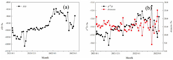 The range of δD (a), δ18O, and d-excess (b) in precipitation from 7 August 2021 to 7 August 2022.