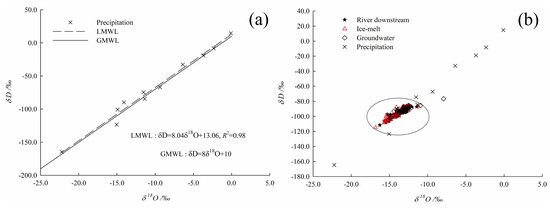 The local meteoric water line (LMWL) in the Mingyong Glacier basin is δD = 8.04δ18O + 13.06, R2 = 0.98, n = 11. There are some differences in the slope and intercept of the meteoric water line in different regions, as well as in the global meteoric water line (GMWL), which is related to the distinctive natural ecological environment of water vapor sources in different places and the specific environmental conditions during the migration of rain cloud droplets. The slope of the local meteoric water line in the Mingyong Glacier basin is very close to that of the global meteoric water line (GMWL): δD = 8δ18O + 10. The larger intercept indicates that the non-equilibrium dynamic evaporation fractionation effect may be higher in the Mingyong Glacier basin, which has important environmental significance. At the same time, the precipitation source in this region is relatively stable and less affected by other environmental factors. Friedman points out that the evaporation of raindrops can cause the meteoric water line to have a slope below 8 due to atmospheric conditions [24]. High temperature and strong evaporation lead to high heavy isotope enrichment and low slope in liquid precipitation. From the perspective of the LMWL slope of the Mingyong Glacier basin, it is very similar to the slope of global meteoric water line and greater than 8, indicating that evaporation in this area is weaker than the inland arid areas. The Mingyong Glacier basin is located in the inland alpine area, and the steam source is far away compared to the coastal area; moreover, the temperature difference between winter, spring, summer, and autumn is not obvious, that is, the annual temperature difference is small [16], indicating that the environment in this area is humid and the evaporation under clouds is not strong. The LMWL intercept of the Mingyong Glacier basin is 13.06, which is larger than the global meteoric water line intercept, indicating that there are multiple sources of water vapor in the study area. This is consistent with the fact that the water vapor sources and influencing factors of precipitation in southwest China are quite complex, including the South China Sea, the Bay of Bengal, the Indian Ocean, the Arabian Sea, and trans-equatorial airflow [13]. The formation and evolution process of precipitation isotopes in inland alpine mountains is complicated, and its differences cannot be viewed alone. For comparison, Figure 10a displays the precipitation in the fitting of the sample line (called LMWL) and the global meteoric water line. Figure 10b displays the Mingyong River’s runoff components of a scatter diagram; it shows that precipitation, groundwater, ice-melt water, and river water (river downstream) are mainly concentrated in the oval circle, and most of the precipitation scatter is not there. This suggests that clustering bodies of water together creates a fairly strong connection. In short, in this region, only ice meltwater and groundwater have strong clustering with the river water (river downstream), while precipitation is far away, indicating that it contributes little to the composition of river water (river downstream).