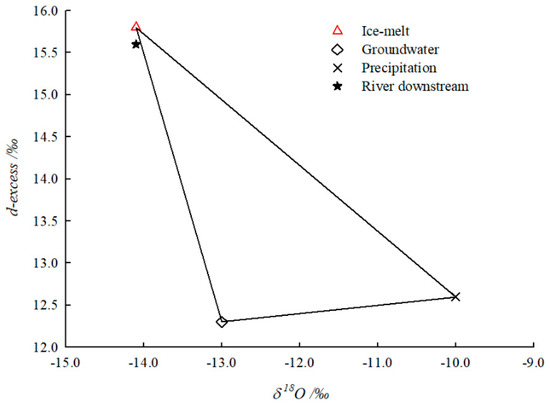 According to the above isotopic content in each water body, the average values of stable isotopes follow the order of precipitation, groundwater, glacial ice, river water (river downstream), ice-melt water, and river water (river midstream). While the average values of deuterium excess follow the order of ice-melt water, river water (river downstream), river water (river midstream), glacial ice, precipitation, and groundwater. The ranges and average values of stable isotopes and d-excess of ice-melt water, river water (river midstream), and river water (river downstream) are close. The average values of stable isotopes between glacial ice and groundwater are close, and the average values of deuterium excess of precipitation are close to groundwater.