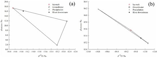 The whole year is further divided into ablation period and accumulation period for specific separation calculation, in which the main ablation period is from June to September, and the accumulation period is from October to the following May. The division is based on the calculation result of mass accumulation balance of Glacier No. 1 of White Water River Glacier at the Yulong Snow Mountain near the study area [25]. The Mingyong Glacier is a typical temperate glacier, which is still in motion during the accumulation period, and the ablation amount at the end of the accumulation period is not zero. Therefore, three end-member hydrograph separation is adopted during the ablation period and accumulation period. In the final calculation formula derived from Formulas (3)–(5), δ18O and d-excess are used as tracers. The results show that the recharge rates of ice-melt water, groundwater, and precipitation to the lower reaches of the Mingyong River are 80.6%, 17.2%, and 2.2%, respectively. According to field research, the lower reaches of the Mingyong River should comprise a mixed water body of ice-melt water, groundwater, and precipitation. Therefore, this study intersects the river water (river downstream) line in the accumulation period with the ice-melt water line, groundwater line, and LMWL to obtain three end members, respectively, as follows: the end member of ice-melt water is δ18O = −14.10‰ and δD = −97.24‰, the end member of groundwater is δ18O = −13.74‰ and δD = −94.74‰, and the end member of precipitation is δ18O = −14.79‰ and δD = −102.14‰. Based on the above end members, the end member of d-excess is obtained. Similarly, with the end member values of δ18O and d-excess as tracers during the accumulation period, the recharge rates of ice-melt water, groundwater, and precipitation to the lower reaches of the Mingyong River are 19.2%, 73.1%, and 7.7%, respectively. The results of hydrograph separation of the lower reaches of the Mingyong River during the ablation period and accumulation period above are shown in Figure 12.