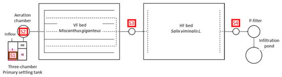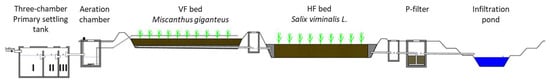 The first bed, with a vertical flow of wastewater (VF), has an area of 70 m2 and a depth of 0.8 m, and the second bed, with a horizontal flow (HF), has an area of 70 m2 and a depth of 1.2 m. The beds were isolated from native soil with a 1 mm thick PEHD waterproofing geomembrane. The VF and HF beds were filled with a layer of sand with a grain size of 1–6 mm. The bed with the vertical effluent flow was planted with giant miscanthus (Miscanthus x giganteus Greef et Deu.), while the bed with the horizontal flow was planted with willow (Salix viminalis L.). On the outflow from the HF bed, a tilting pipe is installed to regulate the level of wastewater in this bed. Treated wastewater is discharged into the ground via an infiltration pond []. The technological system also used a filter with a sorption material for phosphorus removal (Figure 1 and Figure 2), but it was not studied.