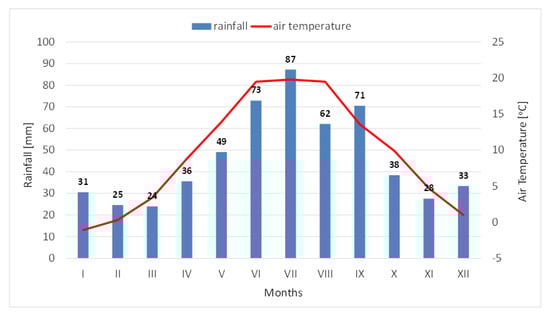 Average monthly rainfall and air temperature for the Sosnowica station in 2017–2022.