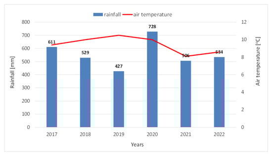 Average annual rainfall and air temperature for the Sosnowica station in 2017–2022.