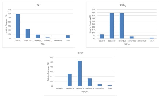 Based on the results, basic statistics were determined for the analyzed pollutant indicators and treatment stages, including mean, minimum, and maximum values, medians, standard deviations, and coefficients of variation. In addition, the relative frequency of characteristic pollutant levels in mechanically treated wastewater entering the biological stage (VF-HF) was determined. The number of class intervals and their range for each pollutant indicator was chosen to make the frequency distribution as detailed as possible without affecting the transparency of the statistical set structure [].