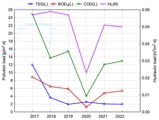The composition of wastewater entering the VF-HF system showed high variability between the years of this study. The highest concentrations were recorded in the early period of this study (2017), which was related to the higher frequency of wastewater delivery from nondrainage tanks. At that time, the average concentration of TSS exceeded 208 mg/L, BOD5 was 153 mgO2/L, and COD was 433 mgO2/L. It was reflected in the pollutant load of the VF bed surface, with TSS close to 12 g/m2∙d, BOD5—9 g/m2∙d, and COD—25 g/m2∙d (Figure 6). During this period, the average load of organic pollutants expressed by COD on the VF bed was higher than the level recommended for Polish conditions by Gajewska []. In the following years, the load of the treatment plant was almost exclusively domestic wastewater flowing from the school building, except during holiday periods, when the delivery of wastewater was necessary due to the condition of plants on the soil–plant beds. From 2018 to 2022, the average annual concentrations of total suspended solids in mechanically treated wastewater were 50 mg/L; only in 2020 did the average exceed the 100 mg/L limit. During the same period, the magnitude of BOD5 took average values of 100 mgO2/L; in 2020, it dropped to approximately 50 mgO2/L. The average annual COD volumes oscillated between 200 and 250 mgO2/L, with the lowest value found to be similar to BOD5 in 2020. The marked decrease in the concentration of organic pollutants (BOD5 and COD) in 2020 was due to the peculiarities of school operations during the coronavirus pandemic. Due to the suspension of teaching activities, the school building mainly generated wastewater related to cleaning work, while there was a smaller share of fecal wastewater, for example. During this period, the unit area load of the VF bed stabilized at a lower level (Figure 6). The average for the entire study period of the VF bed loading of TSS was 4.01 g/m2∙d, BOD5—5.43 g/m2∙d, and COD—13.84 g/m2∙d (Figure 6). These were slightly lower than those recorded at other sites in Poland [,]. However, it is worth noting that in the cited cases, the wastewater came from residential buildings, which firmly determined its composition [].