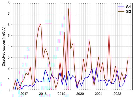 The mean value of BOD5 was 1.96 mgO2/L, and the median was 1.50 mgO2/L (Table 1, Figure 9). The COD values were 26.46 mgO2/L and 25 mgO2/L, respectively. The magnitudes of BOD5 in no case exceeded 10 mgO2/L, and COD exceeded 80 mgO2/L, and by a wide margin met the requirements specified in the applicable legal acts for treatment plants of this size (Figure 9) []. The oxygen content of the treated effluent in the HF bed remained high, having dropped by an average of 0.55 mgO2/L, or approximately 15%, compared to the S3 point.