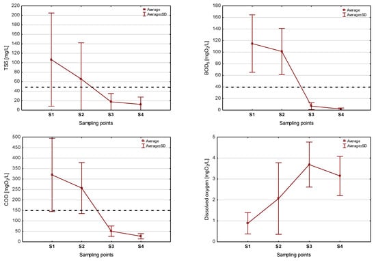 Dynamics of pollutant concentrations in the successive stages of treatment. Notation: dashed black line—Polish requirements specified for wastewater discharged into water and soil from treatment plants below 2000 PE [].