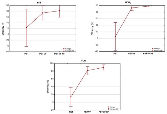 Average efficiency of pollutants removal in the tested VF-HF CWs. Notation: PST—primary settling tank, VF—vertical flow bed, HF—horizontal flow bed.