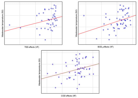 Nonparametric Spearman rank correlation analysis showed correlations between contaminant removal effects at different biological treatment stages and air temperature. Significant correlations were found by analyzing the variation in treatment effects in the VF bed under different seasonal conditions. The correlation coefficients for TSS, BOD5, and COD removal effects were 0.2–0.4 and indicated a weak positive correlation. The determined coefficients were statistically significant (p < 0.05) in all cases (Table 5). The horizontal flow (HF) bed did not show a similar relationship. All correlation coefficients rS had low values and were not statistically significant (p > 0.05).